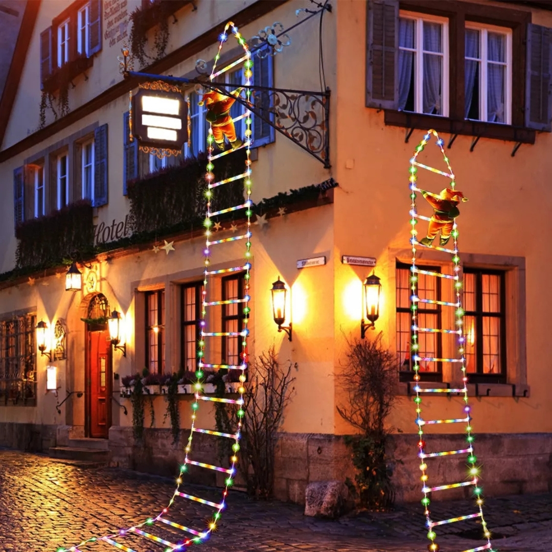 🎅 Santa Claus trepando una escalera luminosa.